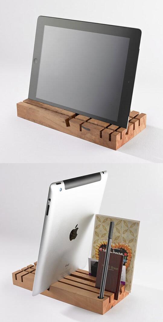 Еще одна самодельная подставка из дерева. На этот раз в нее можно поставить не только планшетный компьютер или смартфон, но и ручки, бумажки, карточки и т.д. Идея простая и отличная.
